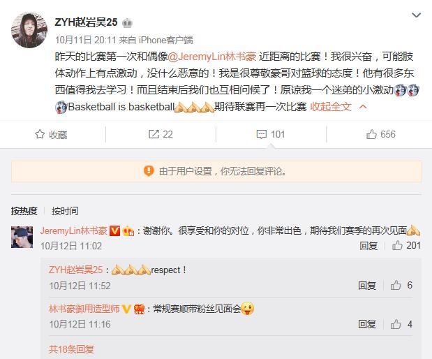 第二天,赵岩昊主动在社交媒体上发声,避免引发不必要的误会。“我很兴奋,可能肢体动作上有点激动,没什么恶意的!我是很尊敬豪哥对篮球的态度!他有很多东西值得我去学习!而且结束后我们也互相问候了!原谅我一个迷弟的小激动,”赵岩昊写道。而刘书豪看到之后也大度地回复:“谢谢你。很享受和你的对位,你非常出色,期待我们赛季的再次见面。”