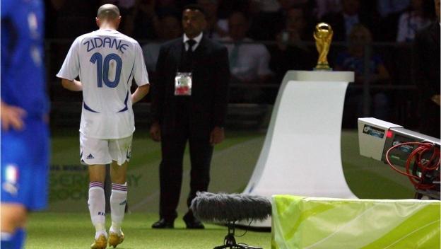 马特拉齐和他发生了口角,众目睽睽之下,齐达内毫无预兆地,用他八年前在决赛梅开二度的光头,撞向马特拉齐的胸口。红牌。