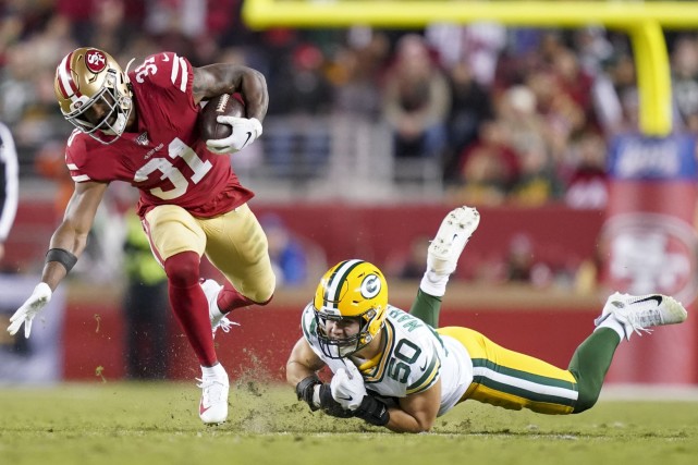 49人方面也是一开始对包装工的进攻口袋施加了非常大的压力。阿里克-阿姆斯戴德在比赛开场几分钟的时候便成功擒杀四分卫罗杰斯,并造成了罗杰斯少见的掉球失误。