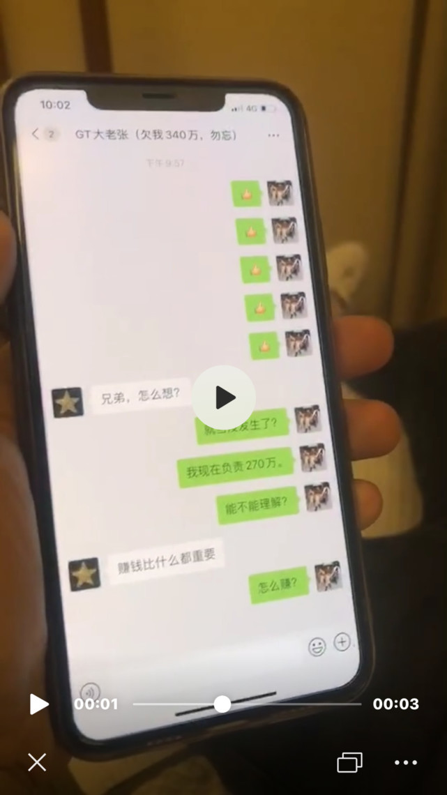 随后有商家发布聊天记录的视频显示,张正平欠他340万,但却私聊他表示“赚钱比什么都重要”。