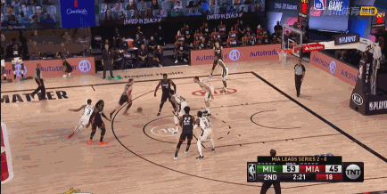 半场还剩2分多钟,热火进攻,德拉季奇突破打乱雄鹿的防守,然后把球抛向空中。阿德巴约和字母哥比跳高,他在最佳防守球员面前完成空接,将球摁入篮筐。