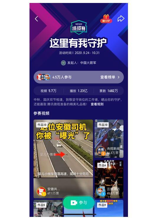 据了解,#这里有我守护#挑战赛是由腾讯微视联合中国火箭军、中国警察网、中国消防、最高人民检察院、中国法院网、中国青年报等政务方共同发起,希望以短视频的形式展现坚守精神,向节庆期间坚守在各个岗位上的工作者致敬。
